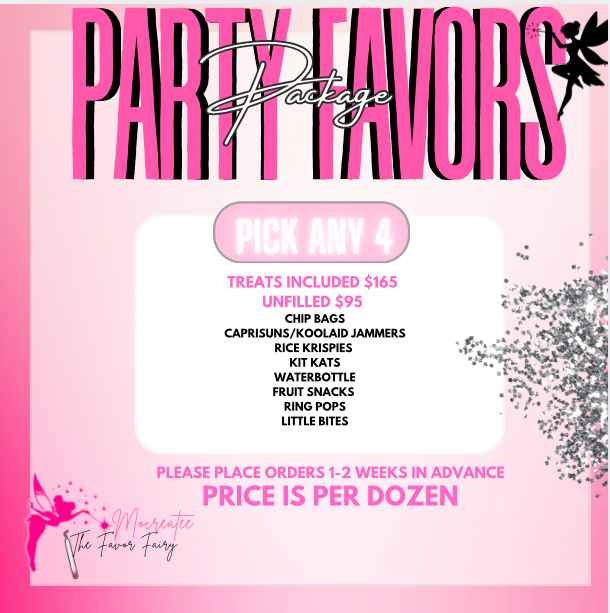 Get the party started with our custom Party Favor Package — perfect for birthdays, baby showers, or any celebration! Each order includes your choice of any 4 personalized favors per dozen. Choose from chip bags, Capri Suns, Rice Krispies, mini Oreos or Chips Ahoy, water bottles, fruit snacks, Ring Pops, or Little Bites. Pricing is $165 per dozen filled with treats or $95 per dozen for wrappers only. Need more than 4 items? You can add extras for just $12 per favor, per dozen, and additional dozens are also $12 each. Orders require a 2-week minimum notice, but rush orders are available for an additional fee. Every design is fully customized and made with love by MoCreatee to bring your event to life!