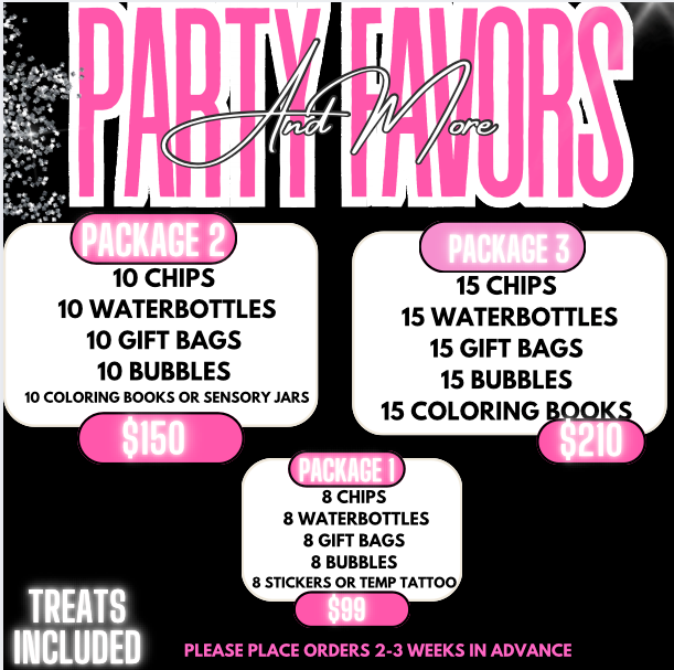 Ready to go all out? Package 3 is for the ultimate celebration! You’ll get 15 chips, 15 water bottles, 15 gift bags, and 15 bubbles to keep everyone smiling. And here’s the best part — I’ll pick between 15 coloring books or 15 sensory jars based on your party’s theme, so everything matches the vibe perfectly. More snacks, more surprises, and more FUN — this one’s made to wow!